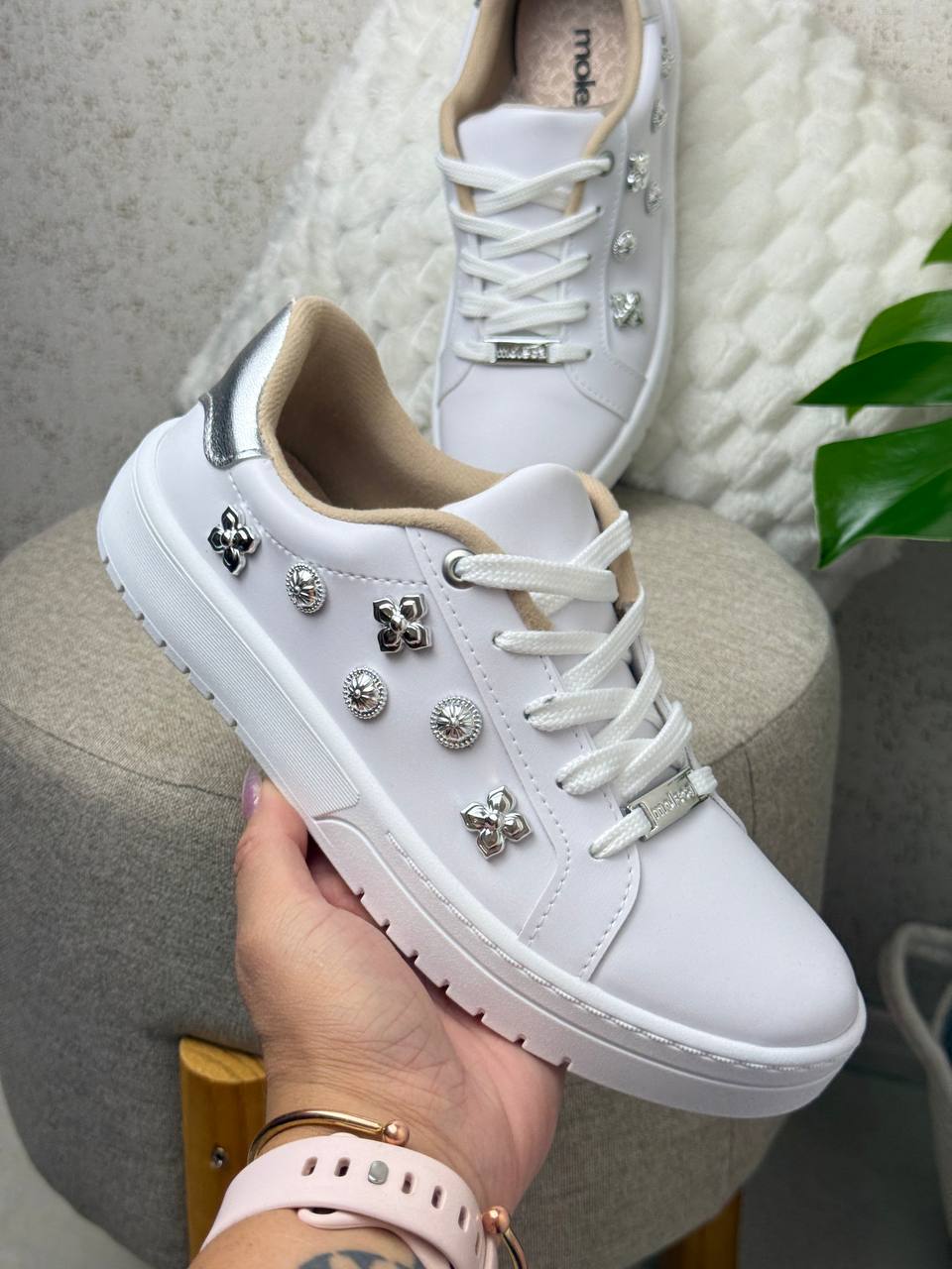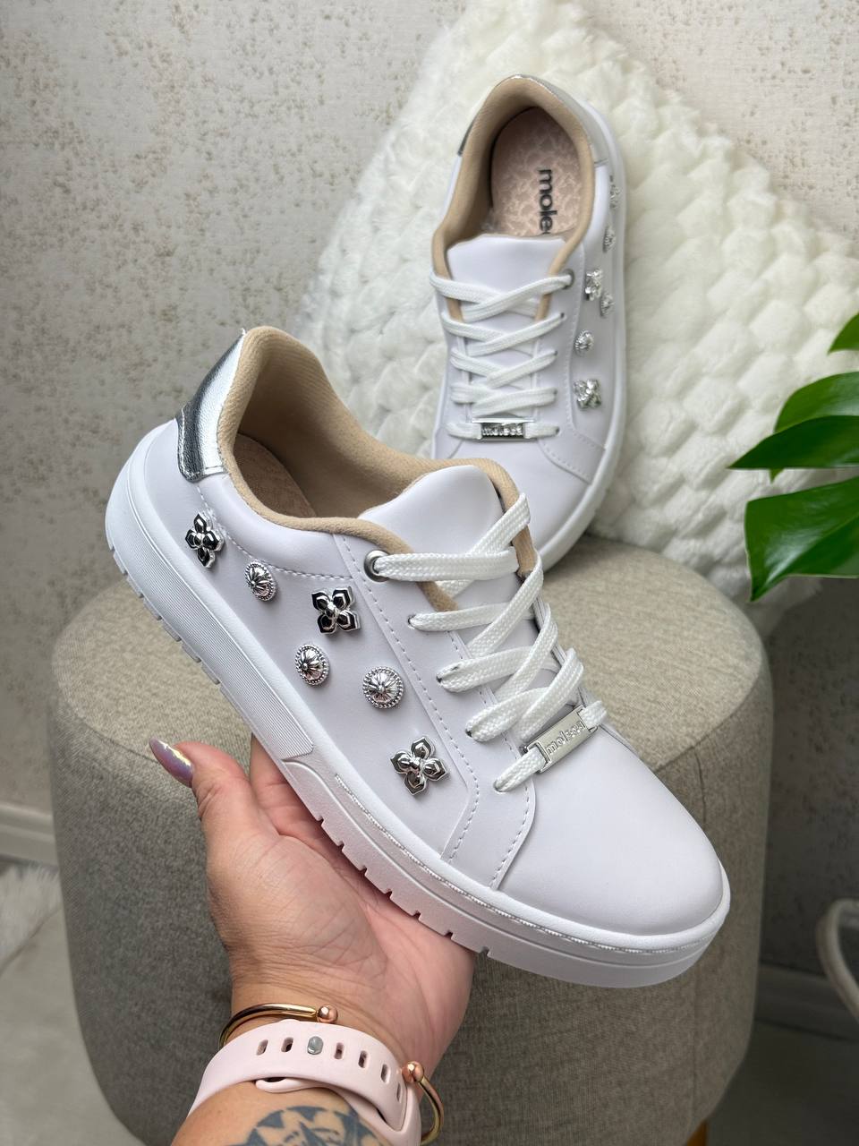 Com um acabamento impecável em material sintético macio, este tênis se destaca por seus detalhes únicos: cadarços delicados e, em especial, os quatro enfeites de metal prateado em formato de flor, adornados com pedrinhas brilhantes que adicionam um toque de glamour discreto e sofisticado.