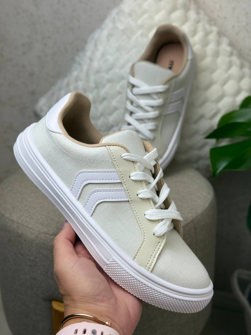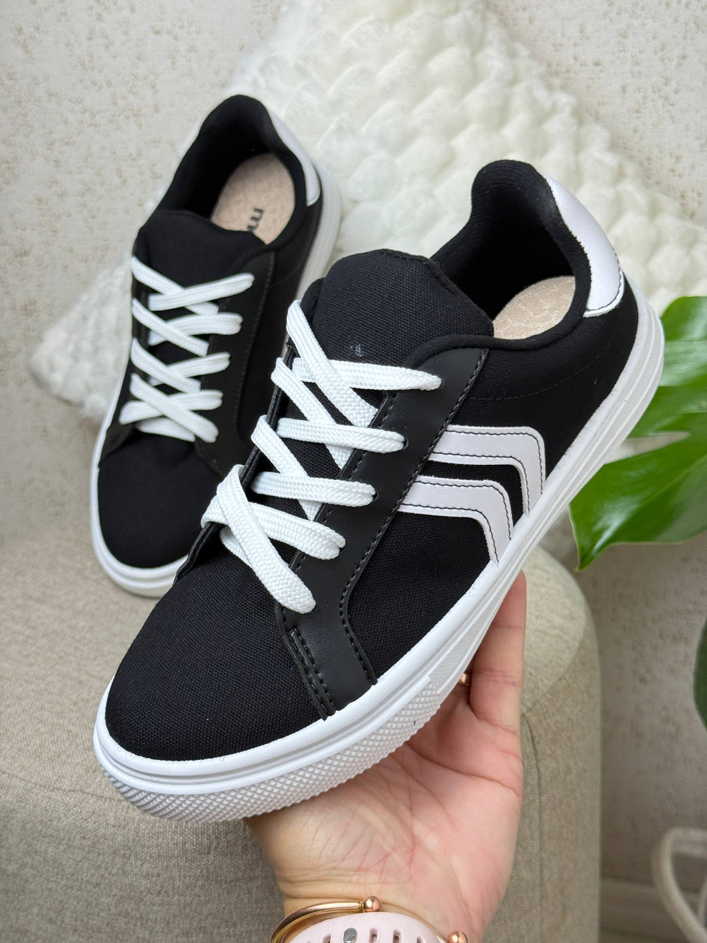 Confeccionado em lona de alta qualidade, este tênis se destaca pelo seu design atemporal, com a biqueira e a sola em material resistente, garantindo durabilidade e um visual moderno. As listras laterais e os detalhes no calcanhar em material sintético em cor contrastante adicionam um charme especial, enquanto as opções de cores preto com branco ou off-white com bege permitem que você escolha o par ideal para expressar sua personalidade.